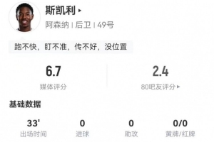 体育资讯1月9日讯 阿森纳在本轮英超对阵利物浦,斯凯利本场数据如下: