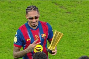 体育资讯01月12日讯 西超杯决赛,巴萨3-2皇马蝉联冠军,拉菲尼亚本场梅开二度,当选决赛MVP。